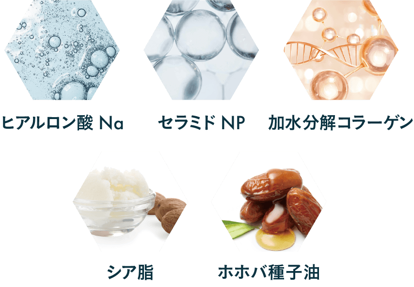 シア脂、ホホバ種子油、スクワラン、プロリン、アスパラギン酸、トレオニン、セリン、グルタミン酸、グリシン、アラニン、バリン、